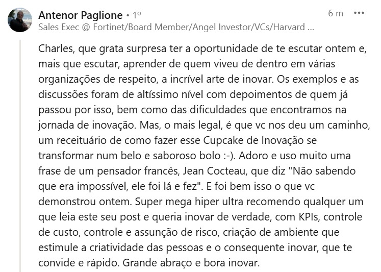 Nesta palestra Charles Schweitzer ensina seu Framework de Inovação e cases de sucesso da implantação dele em empresas como LeroyMerlin e Banco Carrefour.