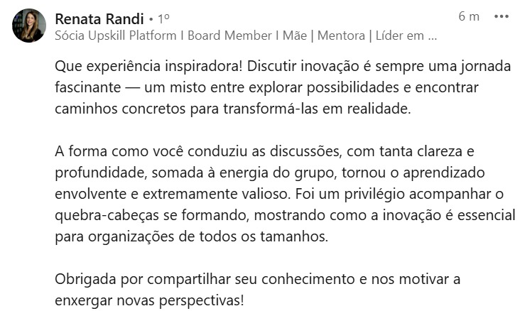 E levar o que eu acredito, com palestras, workshops e mentorias, para empresas que querem crescer, inovar e se transformar sem perder a essência humana: